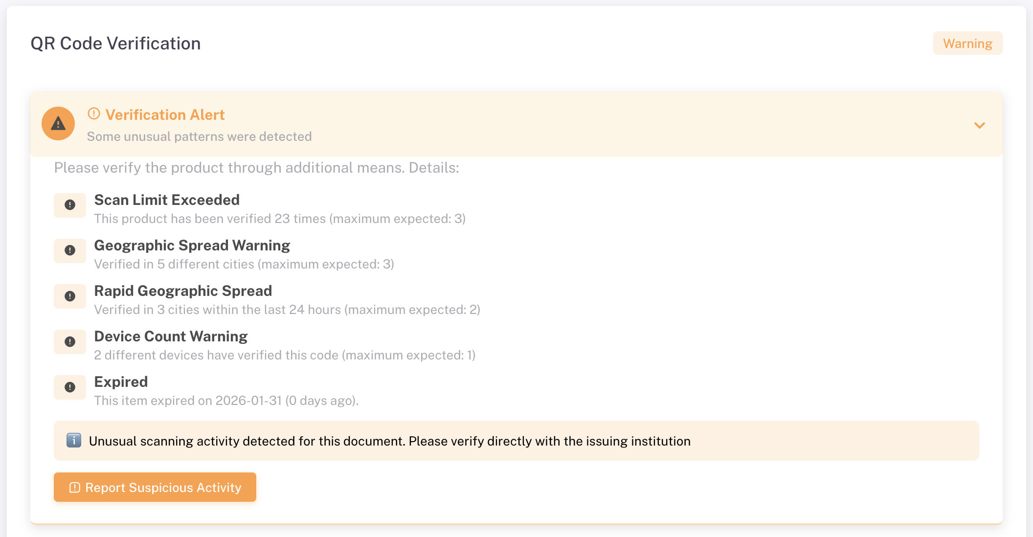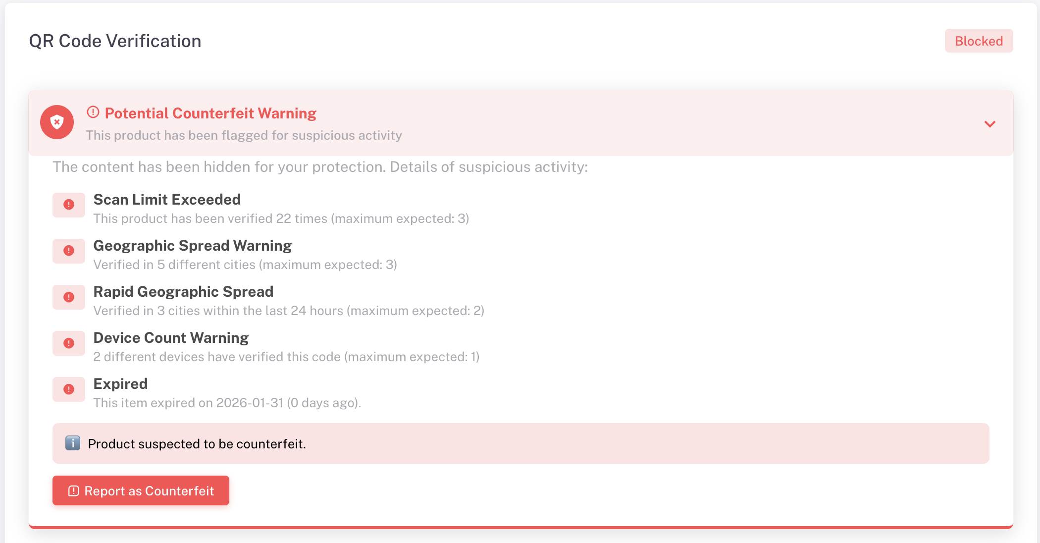 To illustrate, imagine you launch a facial serum, with each package assigned a unique QR code that is allowed to be scanned only once. If counterfeiters replicate the packaging and reuse the same QR code, the system will immediately detect multiple scans for a single code. The verification page will then display a warning message to the consumer, clearly indicating that the product may be counterfeit.